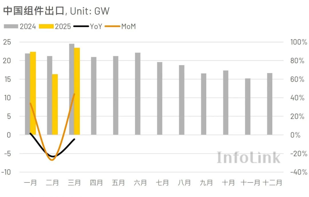 海关数据显示,2025 年 3 月中国共出口约 23.38 GW 的光伏组件,环比上升 44%,与 2024 年 3 月的 24.51 GW 相比下降 5%。截至今年三月底,中国一季度共出口约 61.9 GW 的光伏组件,同比去年 67.62 GW 下降 8%。
