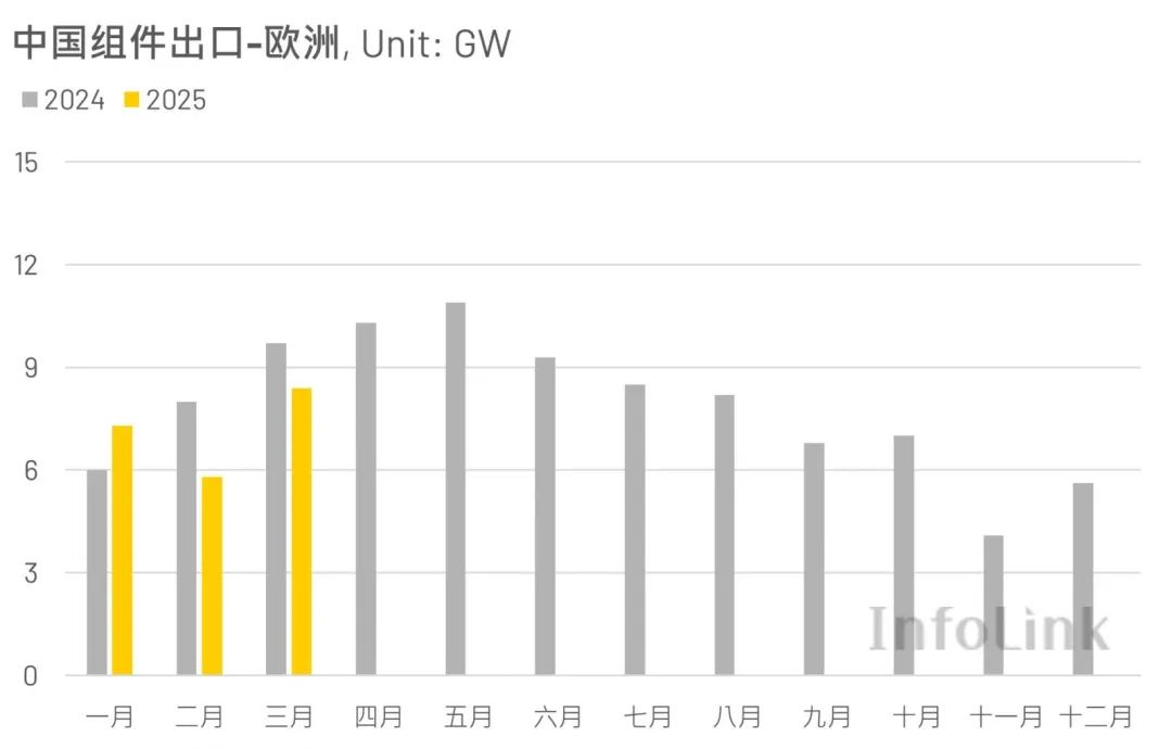 欧洲市场2025 年 3 月中国共出口欧洲市场约 8.43 GW 的光伏组件,环比上升 45%,与 2024 年 3 月的 9.67 GW 相比下降 13%。截至今年三月底,中国一季度共出口欧洲市场约 21.53 GW 的光伏组件,同比去年 23.7GW 下降 9%。