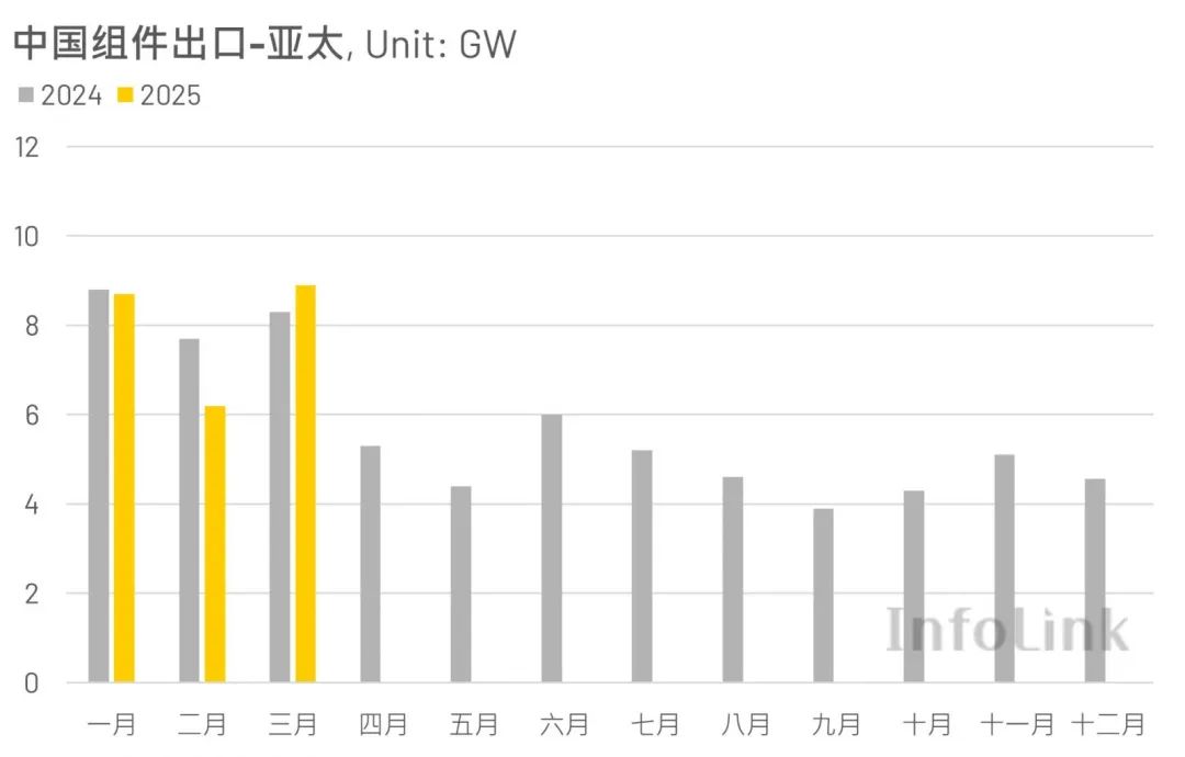 2025 年 3 月中国共出口亚太市场约 8.92 GW 的光伏组件,环比上升 43%,与 2024 年 3 月的 8.31 GW 相比上升 7%。截至今年三月底,中国一季度共出口亚太市场约 23.88 GW 的光伏组件,同比去年 24.75 GW 下降 4%。
