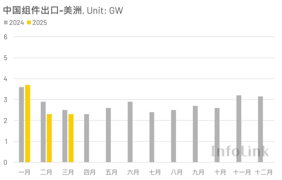2025 年 3 月中国共出口美洲市场约 2.32 GW 的光伏组件,环比下降 1%,与 2024 年 3 月的 2.48 GW 相比下降 6%。截至今年三月底,中国一季度共出口美洲市场约 8.36 GW 的光伏组件,同比去年 9 GW 下降 7%。
