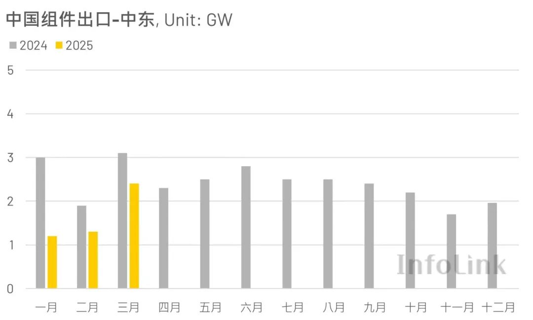 2025 年 3 月中国共出口中东市场约 2.4 GW 的光伏组件,环比上升 82%,与 2024 年 3 月的 3.07 GW 相比下降 22%。截至今年三月底,中国一季度共出口中东市场约 4.9 GW 的光伏组件,同比去年 7.87 GW 下降 38%。