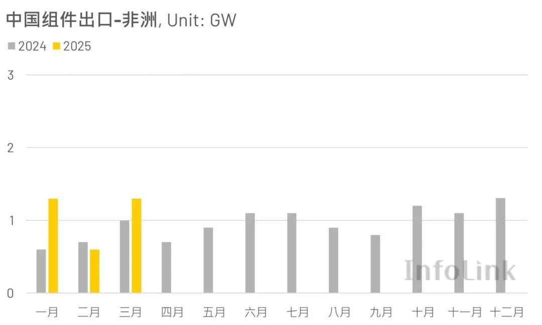 2025 年 3 月中国共出口非洲市场约 1.32 GW 的光伏组件,环比上升 126%,与 2024 年 3 月的 0.99 GW 相比上升 33%。截至今年三月底,中国一季度共出口非洲市场约 3.22 GW 的光伏组件,同比去年 2.31 GW 上升 39%,是唯一同比去年一季度出现成长的区域市场。