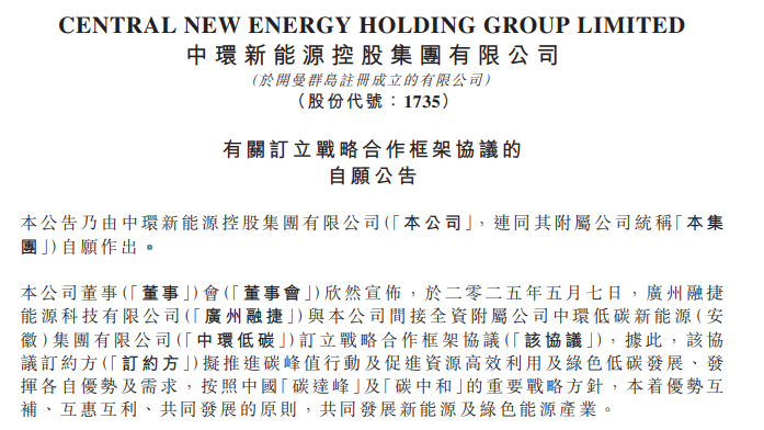 5月7日,中环新能源发布公告称,广州融捷能源科技有限公司(广州融捷)与本公司间接全资附属公司中环低碳新能源(安徽)集团有限公司(中环低碳)订立战略合作框架协议(该协议),该协议订约方拟推进碳峰值行动及促进资源高效利用及绿色低碳发展、发挥各自优势及需求,按照中国“碳达峰”及“碳中和”的重要战略方针,本着优势互补、互惠互利、共同发展的原则,共同发展新能源及绿色能源产业。