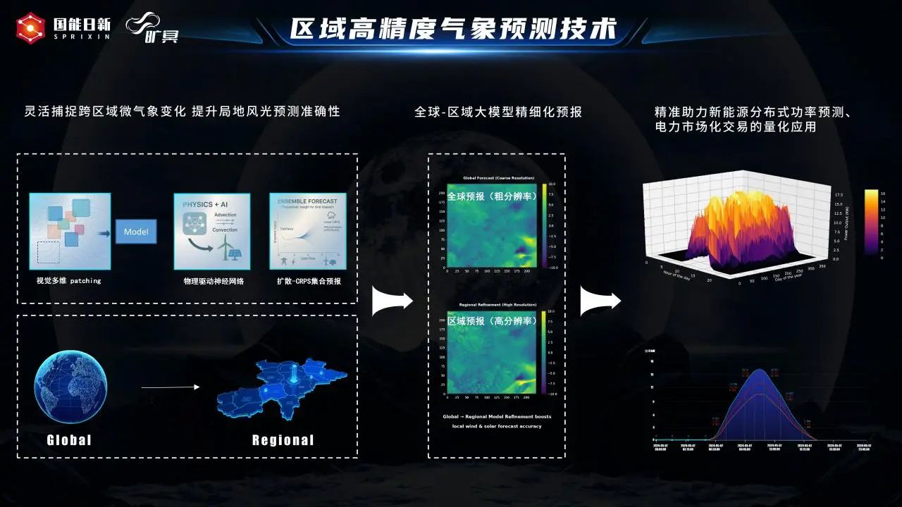 在此背景下,国能日新「旷冥」大模型在「区域精细化预报」、「大数据决策能力」、「极端天气预报强化」三大领域实现新能源预测能力强化,更强大、稳定、精准的数据支持让新能源从“稳定供能”变为“价值创造利器”。