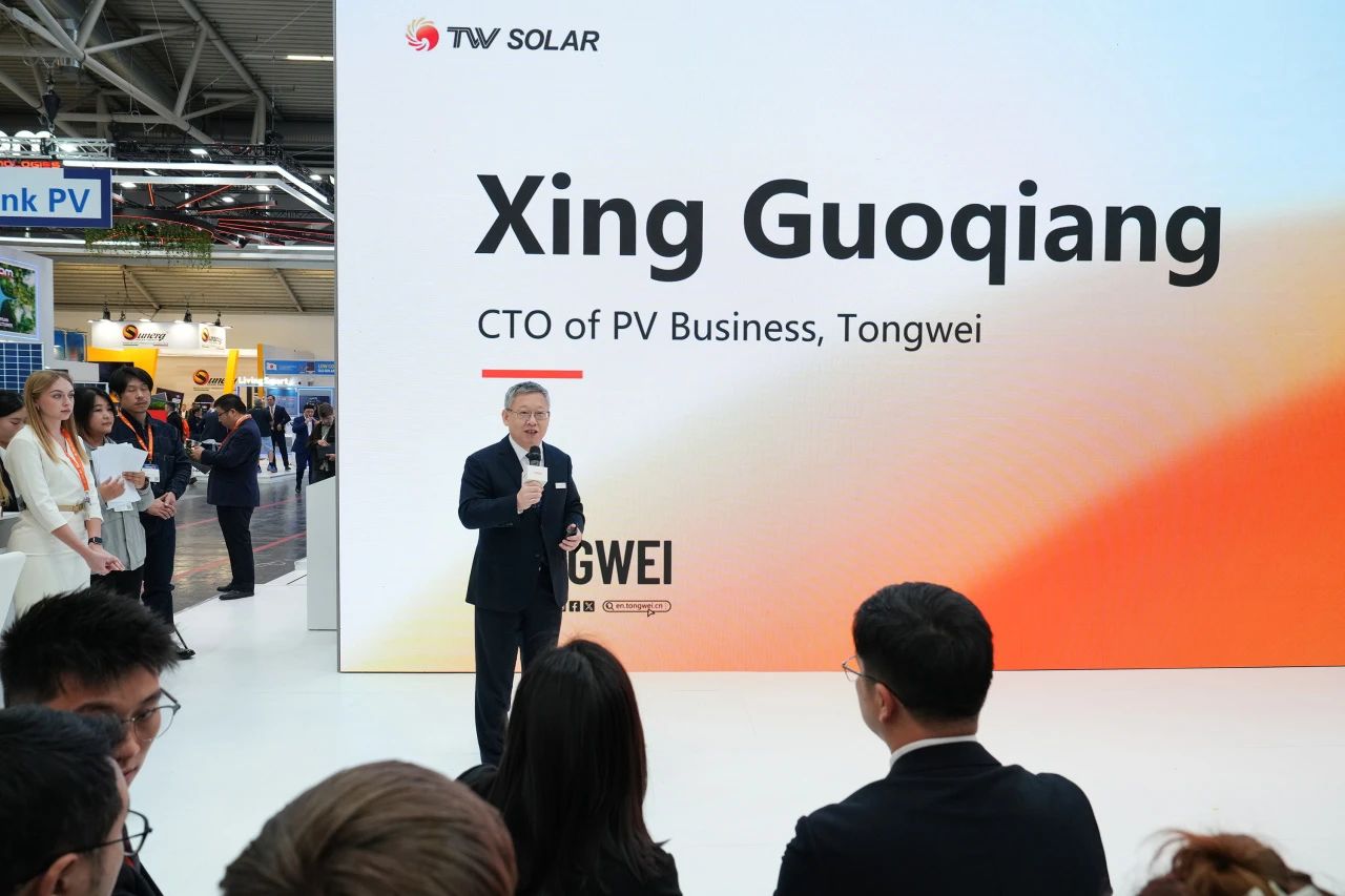 开展首日,“TNC 2.0产品全球发布会·慕尼黑站”盛大揭幕。通威股份董事长、CEO刘舒琪出席发布会并致辞。通威股份光伏首席技术官邢国强博士做产品发布技术演讲,详细介绍TNC 2.0技术优势及客户价值。通威股份行政总监冯畅、营销副总裁邱新、供应链副总裁樊华、光伏商务部组件营销副总经理薛青松出席,同与会嘉宾一道见证全新TNC2.0组件产品的“效能进化”。