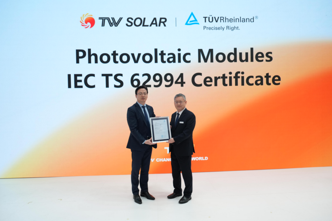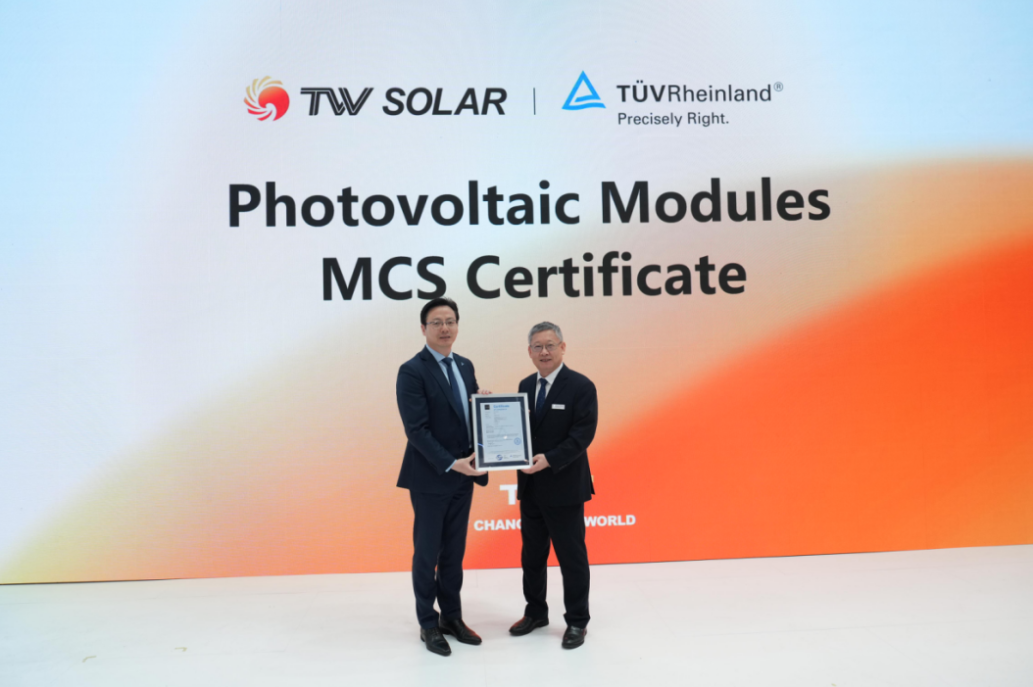 Intersolar展会期间,德国莱茵TÜV集团全球电力电子产品服务副总裁兼大中华区太阳能与商业产品服务副总裁李卫春,向通威颁发《IEC TS 62994:2019》全生命周期环保认证 、MCS认证,邢国强博士代表通威领取证书。