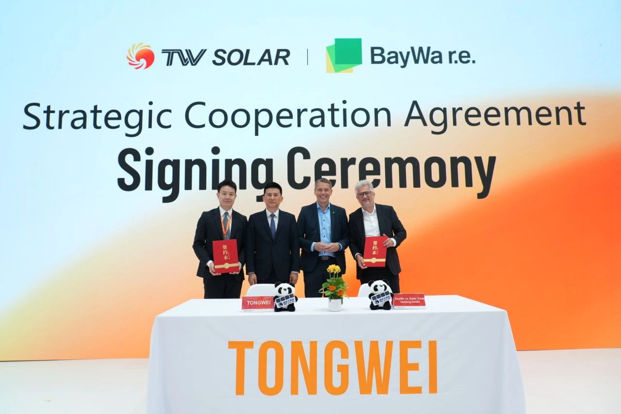 展会期间,通威与欧洲能源服务商BayWa r.e. Solar Trade Holding GmbH正式签署2025年战略合作协议。BayWa r.e. Solar Trade Holding GmbH首席执行官Frank Jessel、通威股份光伏商务部组件营销副总经理薛青松见签。BayWa r.e. Solar Trade Holding GmbH首席战略官Alexander Schütt、通威股份光伏商务部组件营销海外负责人陈方舟代表双方签署协议。双方将在欧洲市场深度布局,围绕TNC 2.0全场景产品开展项目开发、系统集成与运维支持,实现资源共享与优势互补。