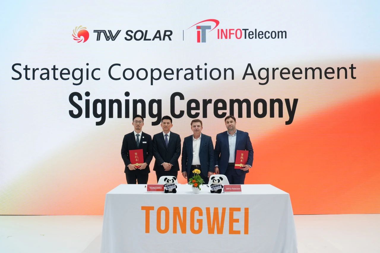 同期,通威与INFO-Telecom签署东欧地区项目供应协议。INFO-Telecom监管事务与发展项目总经理Arben、薛青松副总经理见签。INFO-Telecom技术总监Ramush、通威股份光伏商务部组件营销东欧及美洲区负责人季卫华代表双方签署协议。