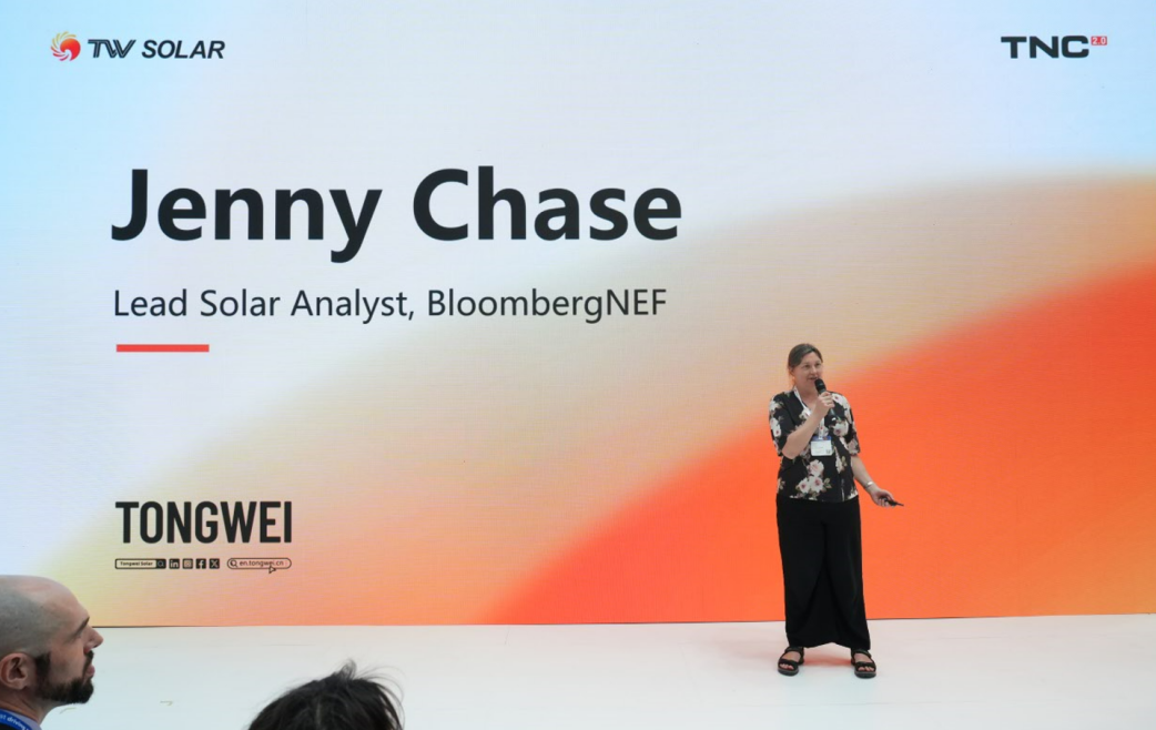 当日,BloombergNEF(彭博新能源财经)光伏首席专家Jenny Chase在通威展台做"全球光伏市场展望"主题演讲,从政策环境、成本趋势及需求预测等方面,深入分析了未来五年全球光伏装机规模的增长动力,她也指出欧洲光伏市场正面临电价波动、激烈竞争等多重挑战。