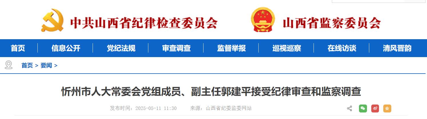 山西省纪委监委5月11日消息,山西省忻州市人大常委会党组成员、副主任郭建平涉嫌严重违纪违法,目前正接受山西省纪委监委纪律审查和监察调查。