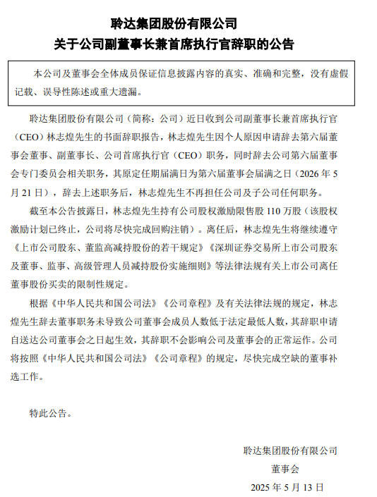 公告显示, 聆达股份近日收到公司副董事长兼首席执行官(CEO)林志煌先生的书面辞职报告,林志煌先生因个人原因申请辞去第六届董事会董事、副董事长、公司首席执行官(CEO)职务,同时辞去公司第六届董事会专门委员会相关职务,其原定任期届满日为第六届董事会届满之日(2026 年 5月 21 日),辞去上述职务后,林志煌先生不再担任公司及子公司任何职务。
