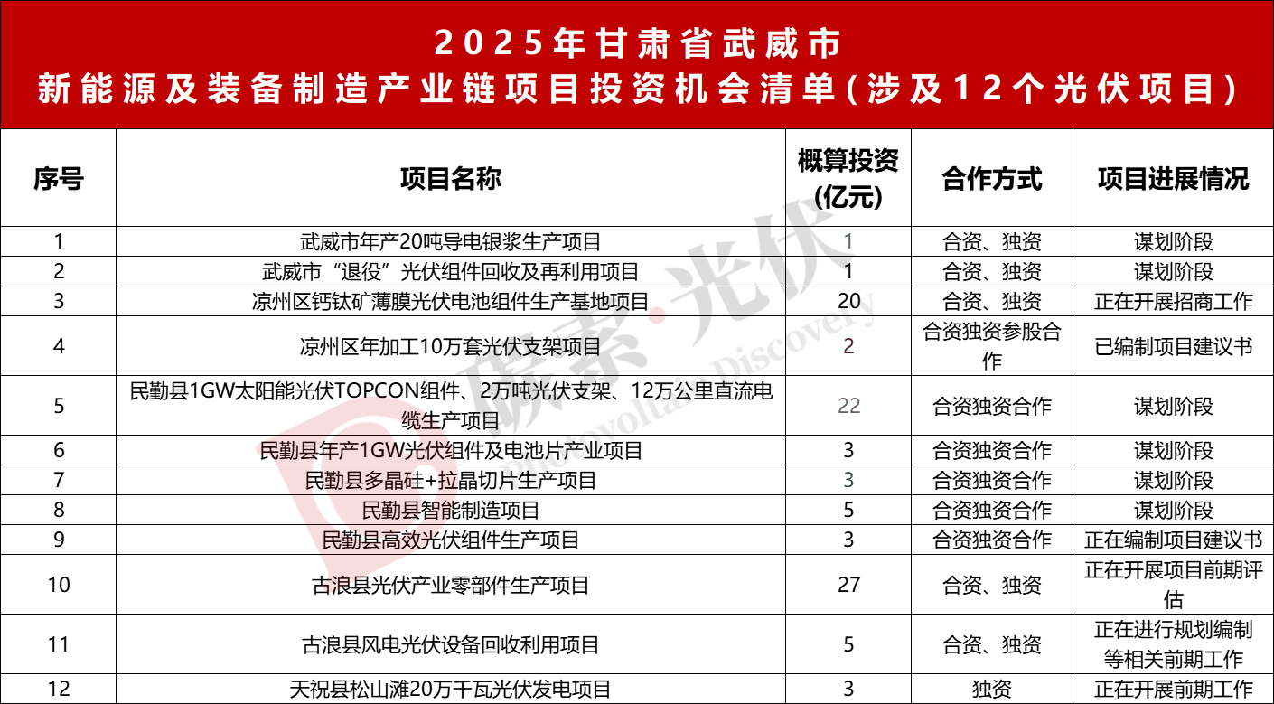 5月13日,甘肃省武威市人民政府公布了2025年武威市投资机会清单,共拟建设53个光伏、储能等新能源及装备制造产业链项目,总投资为566.77亿元,其中包含12个光伏类项目,涉及投资金额95亿元。