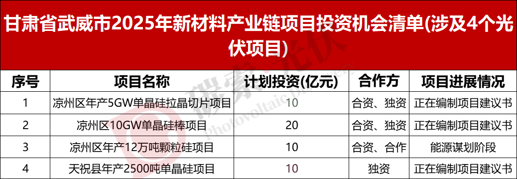 在3月5日,甘肃省武威市人民政府公布了2025年武威市投资机会清单,共有54项新材料产业链项目,总投资为359.4亿元,其中涉及4个光伏项目,涉及投资金额50亿元。