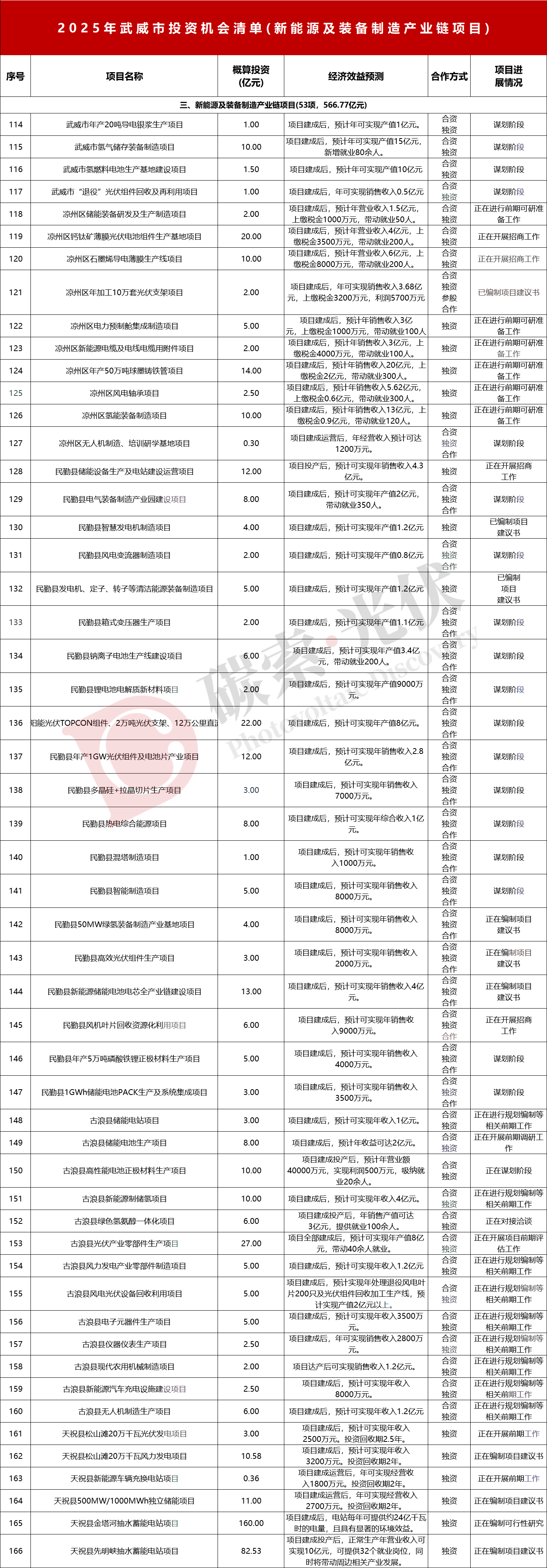 下表为2025年武威市新能源及装备制造产业链项目投资机会清单(53项):