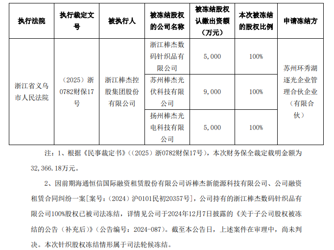 棒杰股份经公开渠道查询,并结合浙江省义乌市人民法院送达的《民事裁定书》((2025)浙0782财保17号),获悉公司持有的下属子公司浙江棒杰数码针织品有限公司100%股权、苏州棒杰光伏科技有限公司100%股权、扬州棒杰光电科技有限公司100%股权被司法轮候冻结及冻结,具体情况如下: