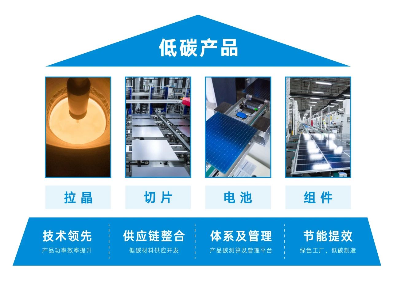 产品碳足迹是指产品整个生命周期所产生的温室气体排放量。碳足迹低的产品代表着产品的技术创新性,供应链整合能力,管理体系完备及制造环节的高效节能,是产品的重要先进性指标。也是法国能源监管委员会(CRE)评估光伏产品入围资格及产品性能的重要指标之一。天合光能拉棒、硅片、电池、组件各生产制造环节顺利通过法国环境与能源控制署(ADEME)严苛核查,并取得优异碳值表现。天合光能组件产品的碳足迹值从550kg eq CO₂/kWc降至400kg eq CO₂/kWc,再到凭借最新先进技术减至300kg eq CO₂/kWc,充分表明了公司在持续大幅度降低产品全生命周期温室气体排放量方面的努力,为行业树立了绿色低碳产品设计、制造的标杆。