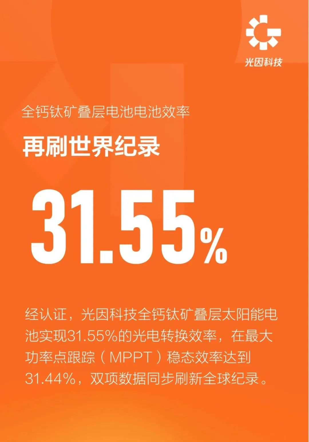 近日,光因科技在全钙钛矿叠层太阳能电池领域取得新进展,经认证,光因科技研发的全钙钛矿叠层太阳能电池在测试中实现31.55%的光电转换效率,在最大功率点跟踪(MPPT)稳态效率达到31.44%,双项数据同步刷新全球纪录。