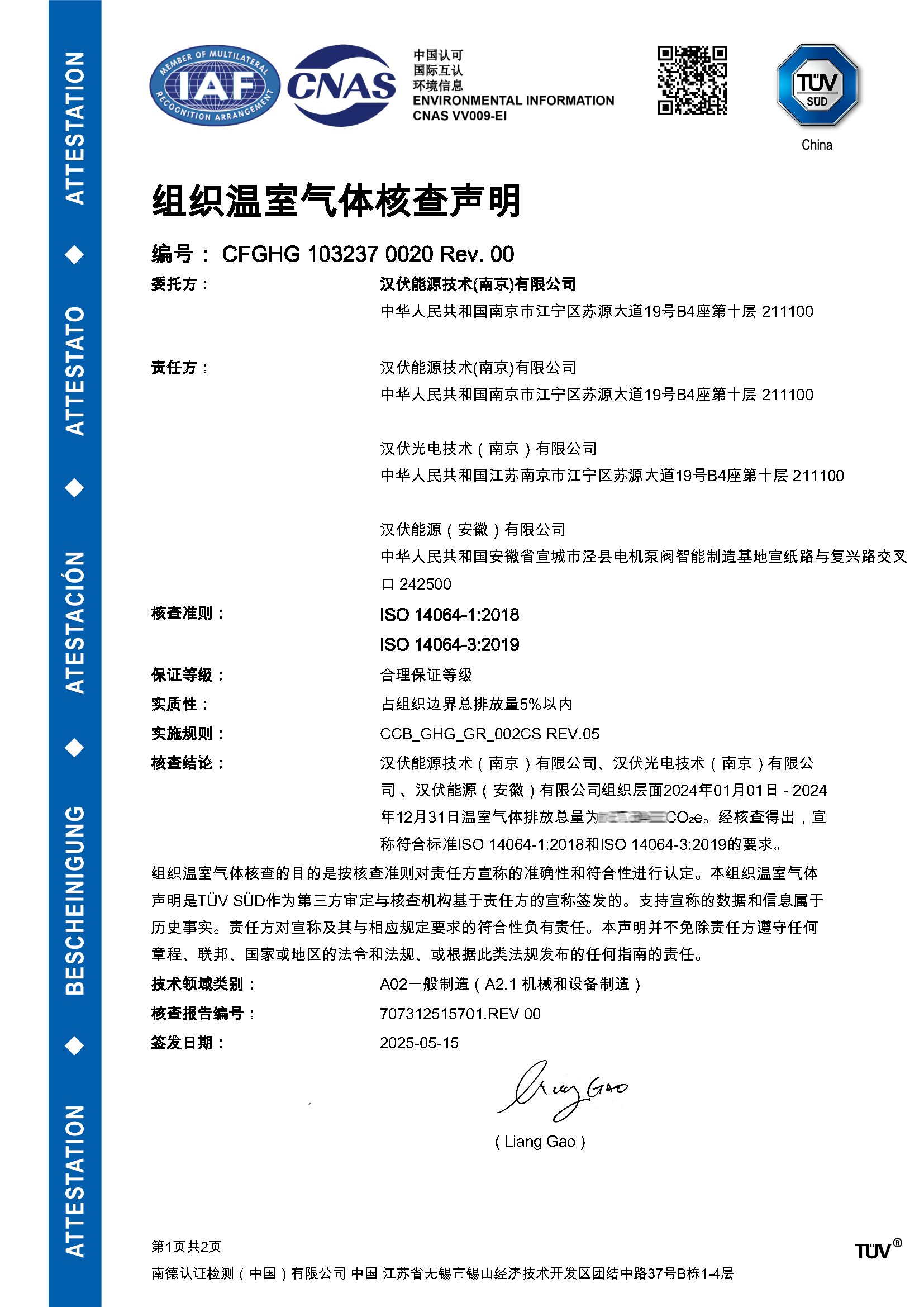 五月,汉伏能源顺利通过TÜV南德组织的碳核查,获得ISO 14064组织温室气体核查声明。本次核查所呈现出的单位碳排放强度处于行业相对较低水平,充分展现了汉伏能源在绿色制造、能源结构优化及碳数据体系建设方面的阶段性成果,也印证了公司在ESG战略上的前瞻部署与系统推进。
