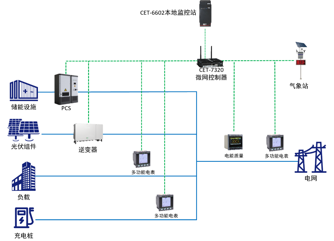 CET中电技术光储充一体化智能微电网方案以自主研发的微网控制器(CET-7320)与微网本地监控站(CET-6602)为核心控制中枢,整合系统内分布式光伏、储能系统、充电桩等设备。方案具体功能如下: