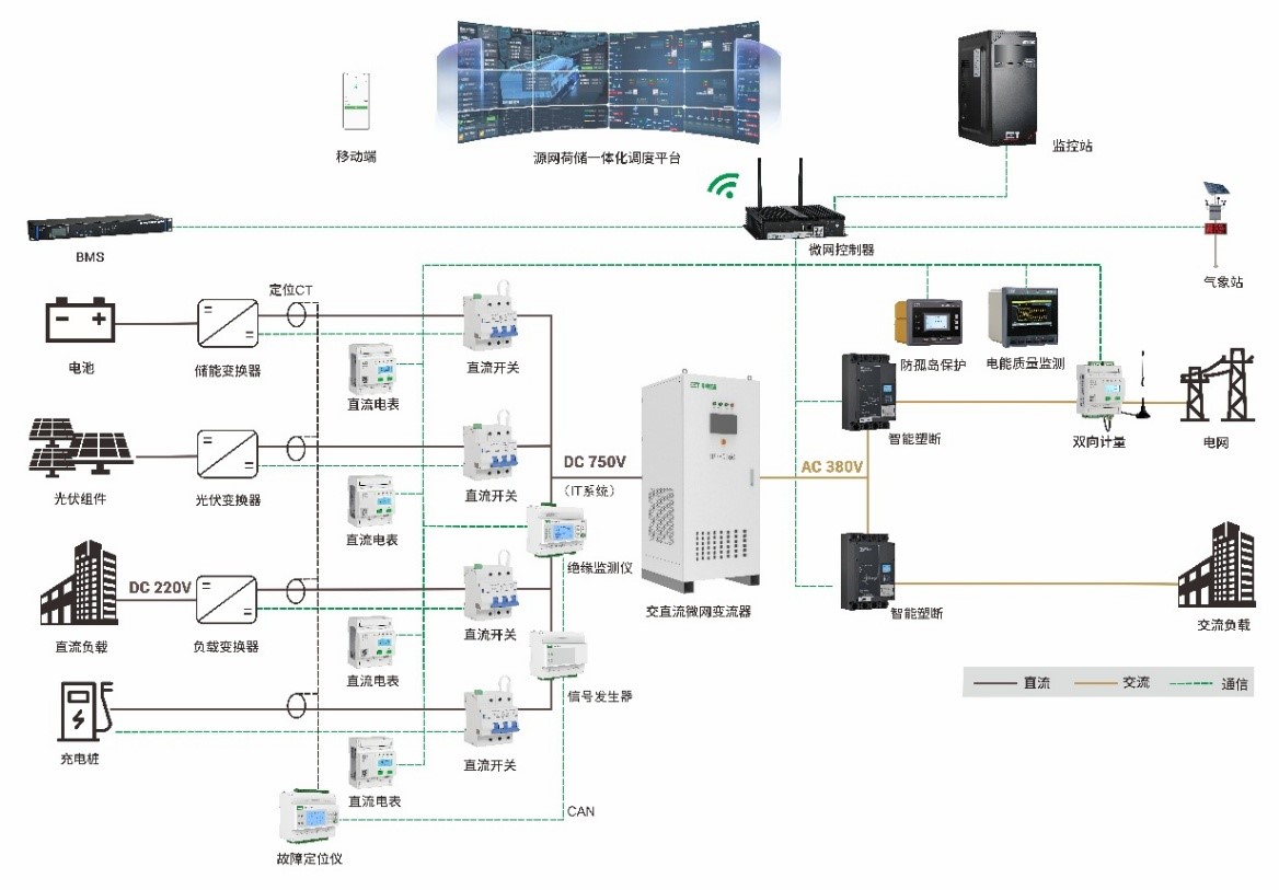 CET建筑光储直柔系统解决方案通过搭建光储直柔综合管理控制系统可监视系统内光伏、储能、各类交直流负荷,通过单双向变换器以及双向变流器将交直流系统进行互联,通过自动控制策略自主进行柔性调节保证系统的安全稳定运行,充分发挥系统柔性,使建筑从电能的“消费者”转变为“供能者”。