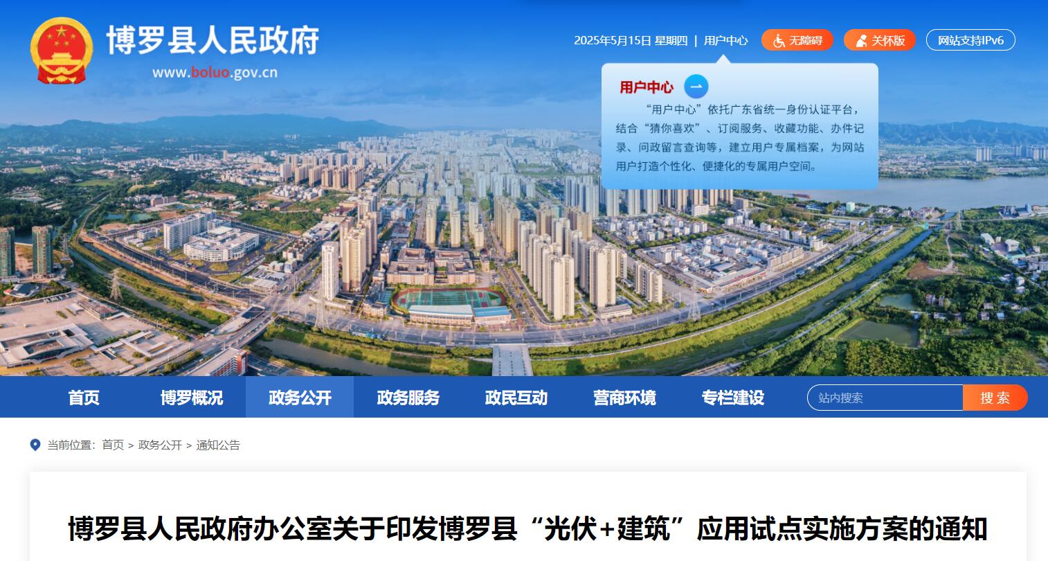 5月13日,广东省惠州市博罗县人民政府印发《博罗县“光伏+建筑”应用试点实施方案》,《方案》提出,到2025年底,形成政府引导、市场运作、多方共赢的建设开发模式;新建各类园区实现分布式光伏全覆盖,新建公共机构屋顶光伏覆盖率不低于50%;建成具有良好示范效果的农房不少于1000户,年度新增装机规模不少于7万千瓦。到2026年底,实现符合条件的建筑宜装尽装,年度新增总装机规模不少于8万千瓦。