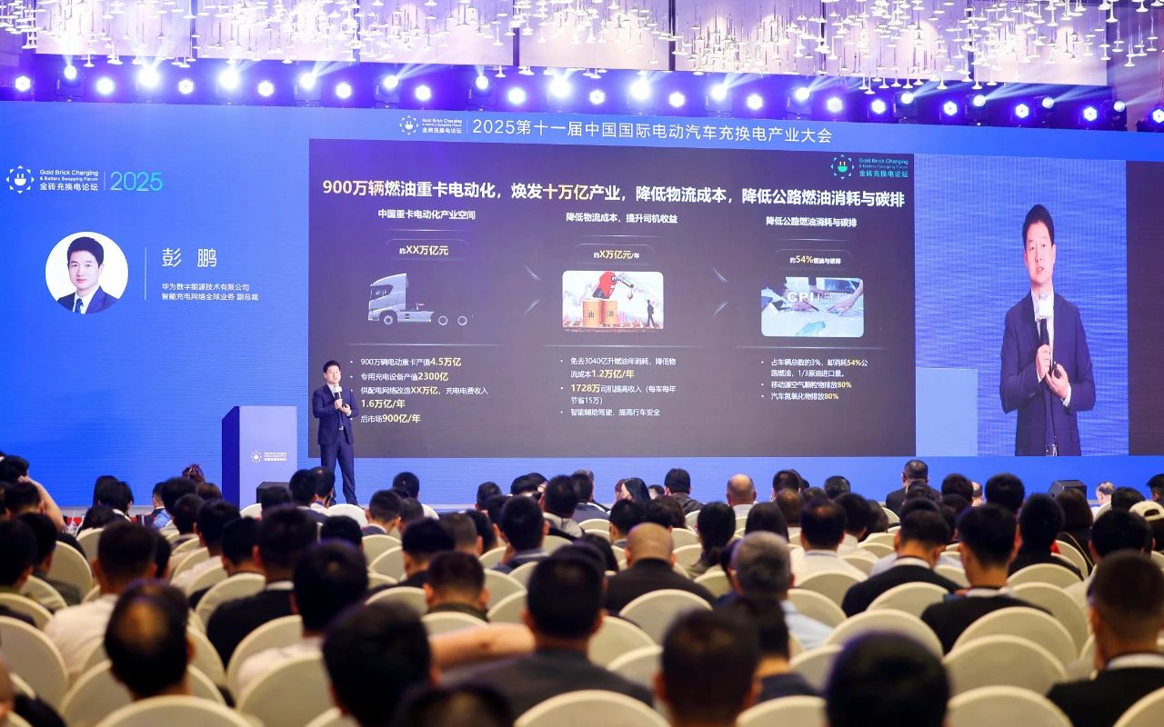 会议期间,华为智能充电网络全球业务副总裁彭鹏受邀发表《兆瓦超充技术加速商用车电动化进程》主题演讲。依托华为数字能源在充电网络产业的深入研判,系统预测以重卡物流为代表的新一波汽车电动化浪潮下,构建交能融合型充电基础设施是未来高质量发展的关键。2025年开始电动重卡将凭借购置运营成本及减排效果迎来长达十年以上强劲的市场表现,华为兆瓦超充可彻底打通产业断点,以车型高兼容、运营易维护、建站省占地等多重优势,全面领先换电等技术路线。