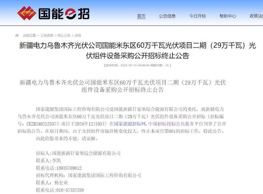 5月15日,新疆电力乌鲁木齐光伏公司国能米东区60万千瓦光伏项目二期(29万千瓦)光伏组件设备采购终止,公告称,由于项目期间光伏组件市场价格变化较大,终止本项目招标工作。
