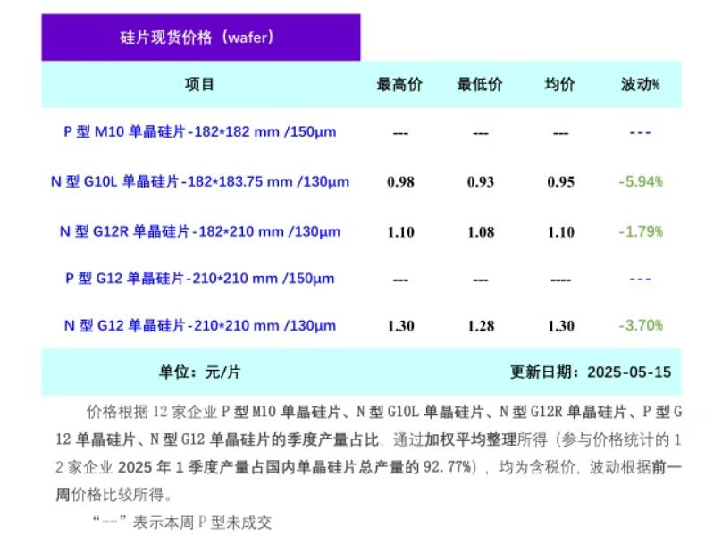 本周硅片价格继续下跌,其中N型G10L单晶硅片(182*183.75mm/130μm)成交均价在0.95元/片,周环比跌幅5.94%;N型G12R单晶硅片(182*210mm/130μm)成交均价在1.10元/片,周环比跌幅1.79%; N型G12单晶硅片(210*210 mm/130μm)成交均价在1.30元/片,周环比跌幅3.70%。本周上下游成交清淡,市场情绪较为消极,硅片价格继续下滑。