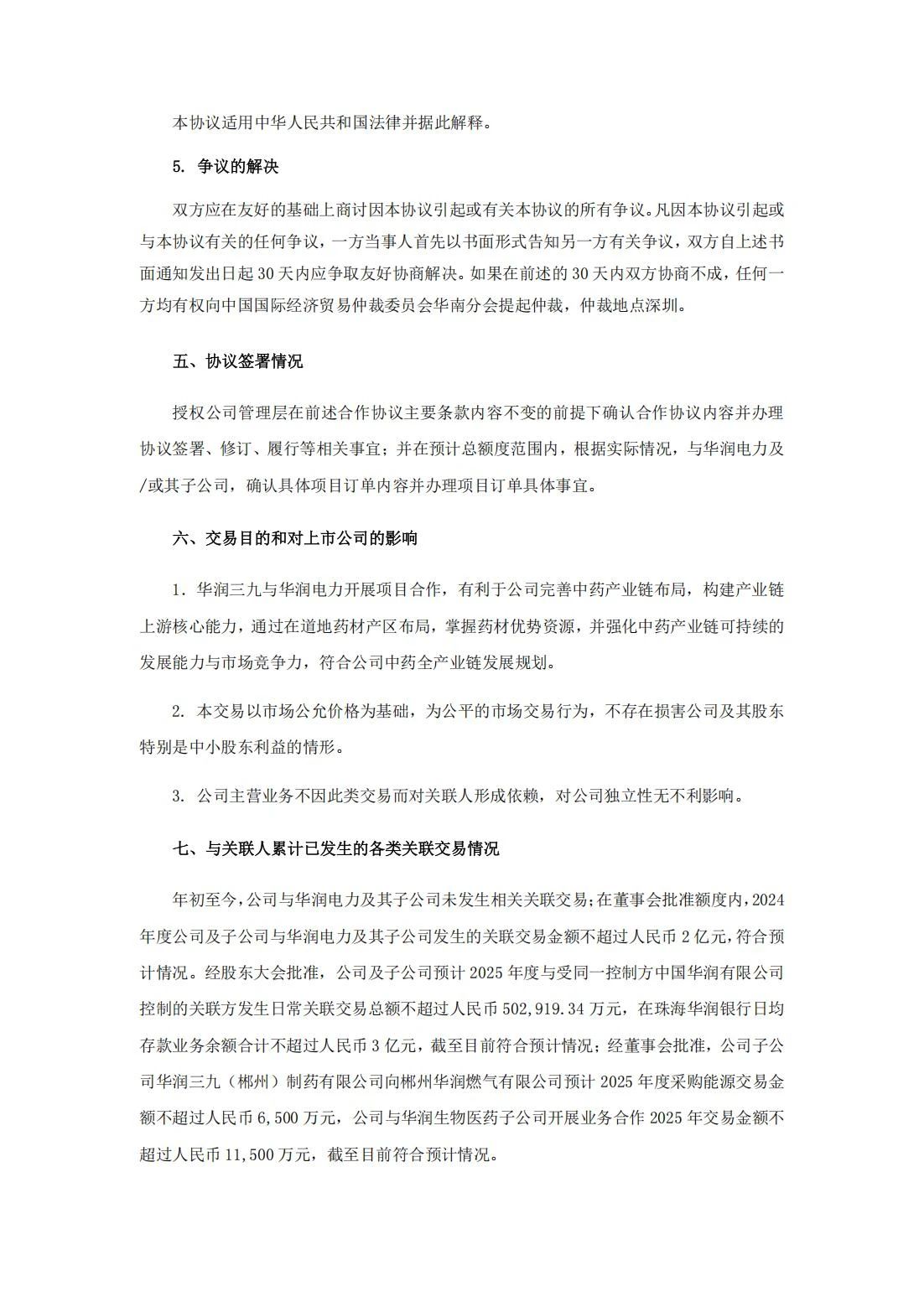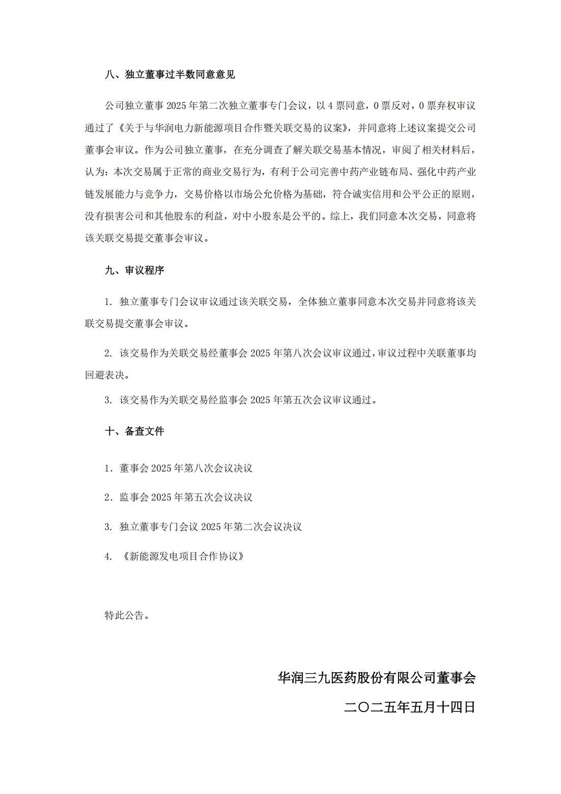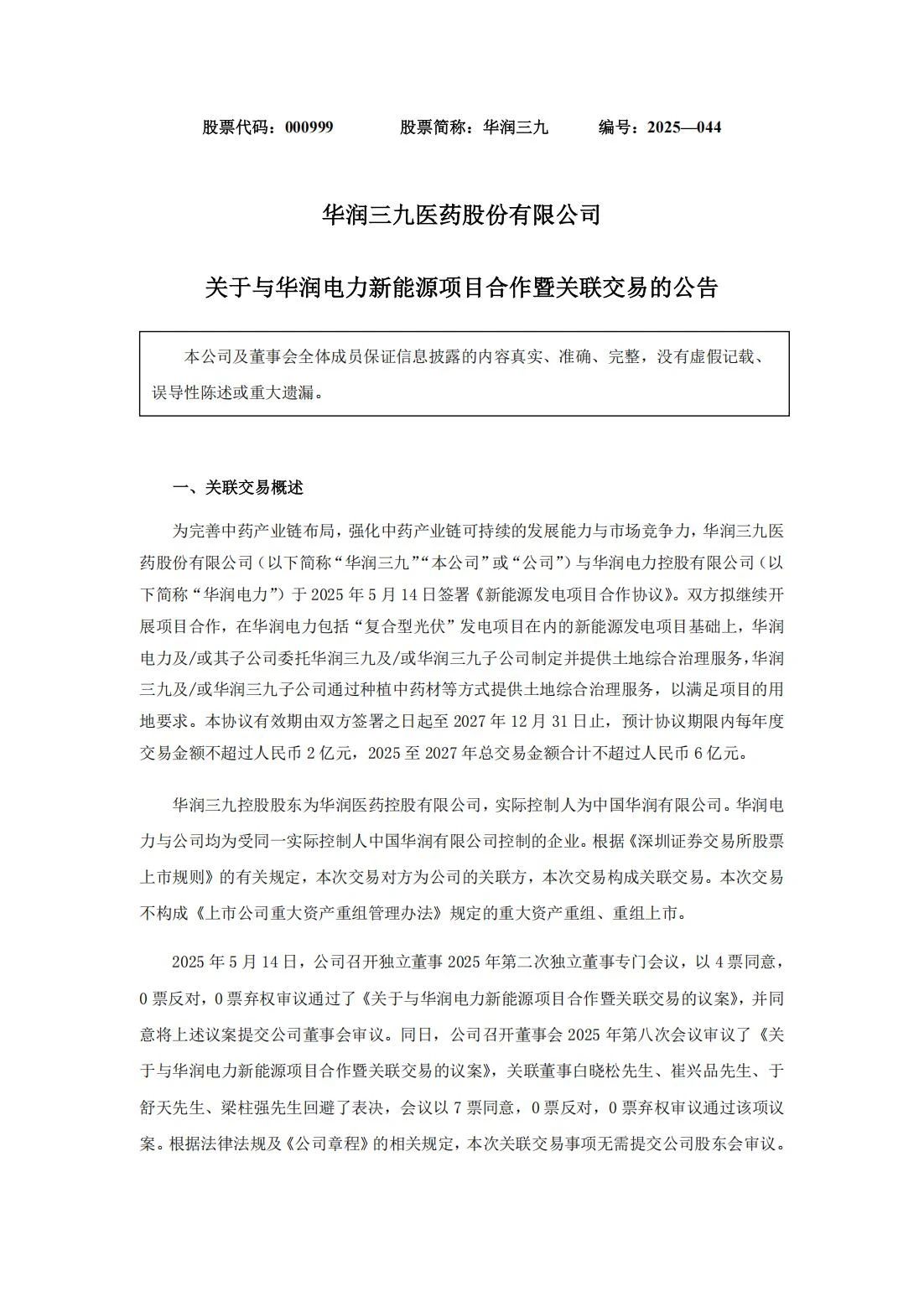 5月15日,华润三九发布关于与华润电力新能源项目合作暨关联交易的公告。公告表示,华润三九医药股份有限公司(以下简称“华润三九”“本公司”或“公司”)与华润电力控股有限公司(以下简称“华润电力”)于2025年5月14日签署《新能源发电项目合作协议》。