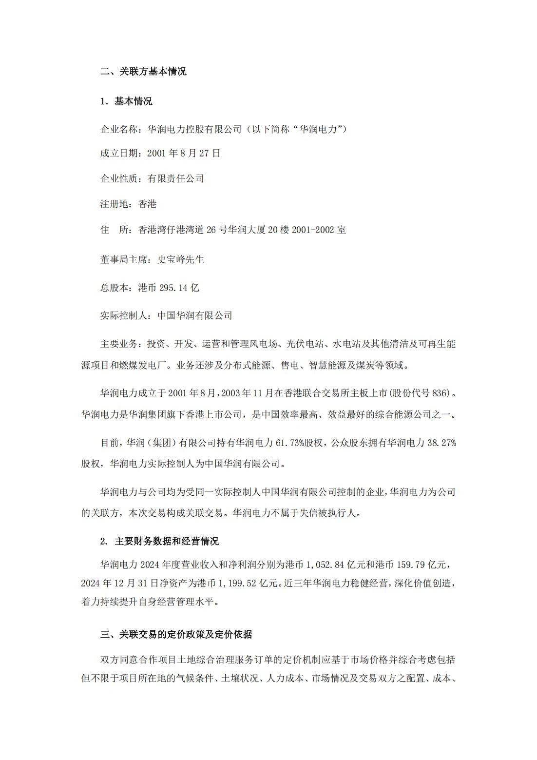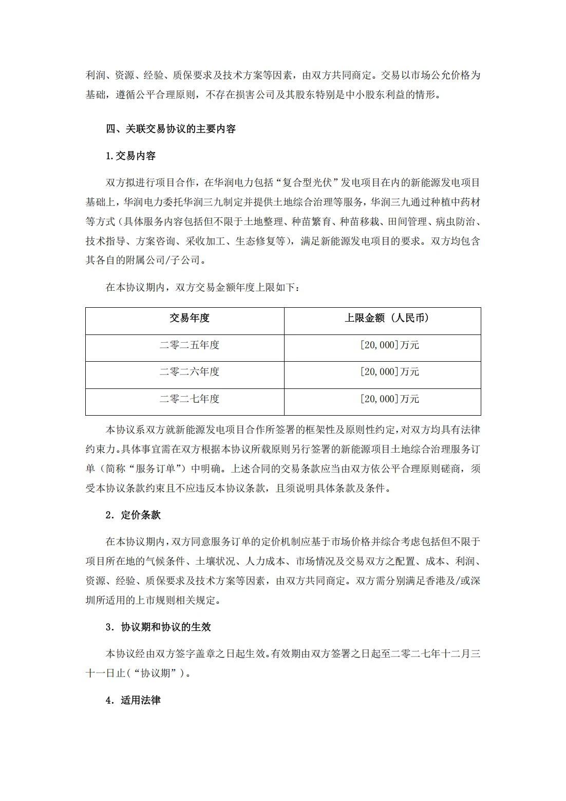 据了解,双方拟继续开展项目合作,在华润电力包括“复合型光伏”发电项目在内的新能源发电项目基础上,华润电力及/或其子公司委托华润三九及/或华润三九子公司制定并提供土地综合治理服务,华润三九及/或华润三九子公司通过种植中药材等方式提供土地综合治理服务,以满足项目的用地要求。