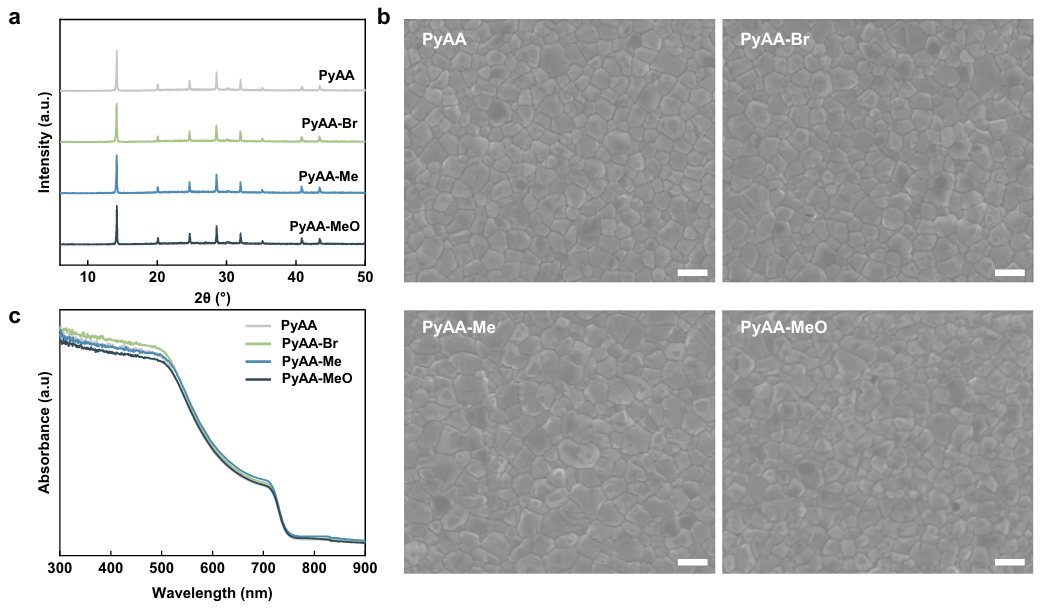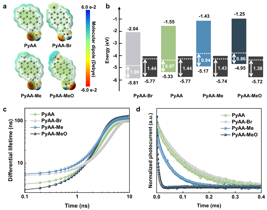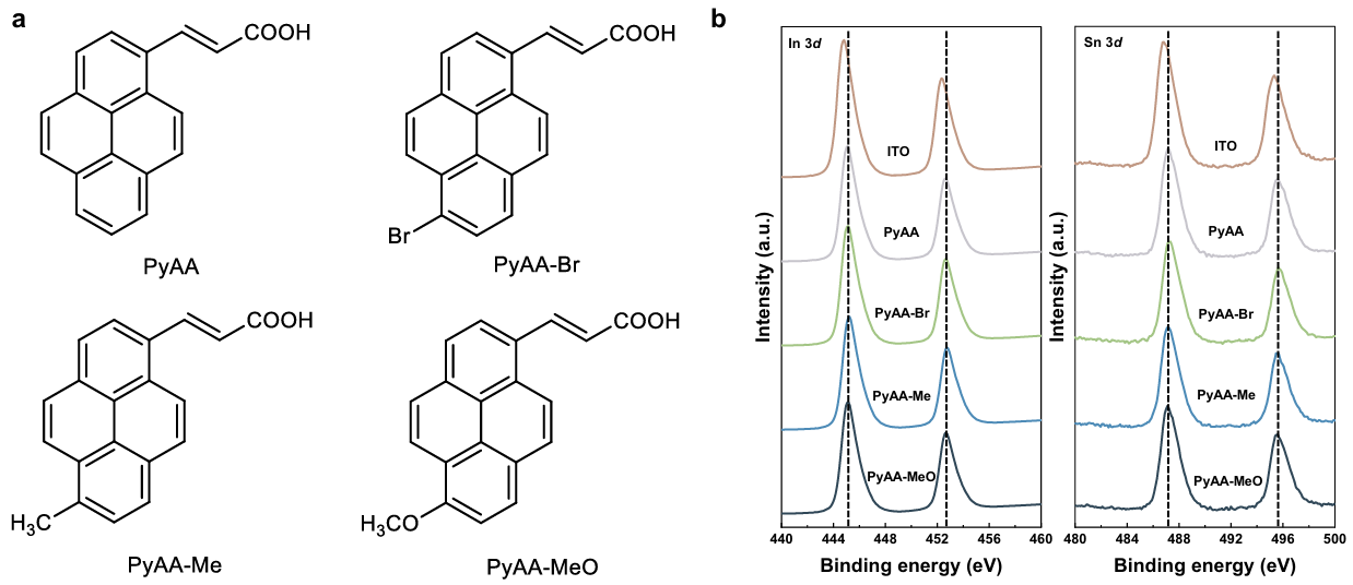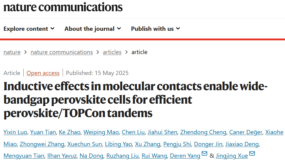 用作空穴选择接触的有机分子,称为自组装单层(SAM),在确保高性能钙钛矿光伏发挥作用。SAM和钙钛矿之间的最佳能量对齐对于所需的光伏性能至关重要。但是,许多SAM在最佳带隙的钙钛矿中进行了充分研究,专门针对宽带隙钙钛矿SAM的能量水平修饰较少。鉴于此,2025年5月15日浙江大学薛晶晶&杨德仁院士于Nature Communications刊发分子接触中的诱导效应使宽带隙钙钛矿电池能够实现高效的钙钛矿/TOPCon叠层的研究成果,研究证明可以通过共轭部分中的电感效应系统地对SAM的能级进行系统的调控,从而使适合特定钙钛矿带隙的合理设计。根据调控的SAM,所得的WBG钙钛矿器件的功率转化效率为22.8%。与晶硅TopCon子电池的进一步集成,可以获得效率为31.1%的钙钛矿/TOPCON叠层器件(认证30.9%)。