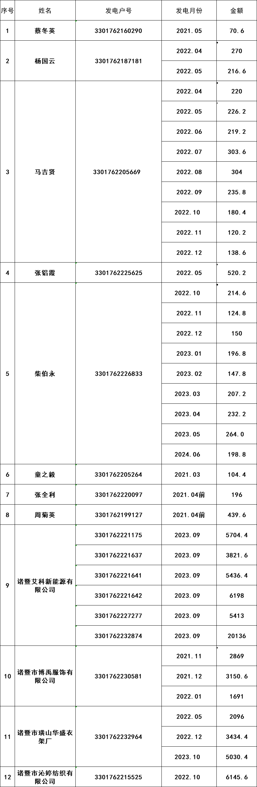 根据《绍兴市发展和改革委员会绍兴市经济和信息化委员会 绍兴市财政局 绍兴电力局转发<关于浙江省2018年支持光伏发电应用有关事项的通知>的通知》(绍市发改能通〔2018〕35号)、《诸暨市人民政府关于加快分布式光伏发电应用的实施意见》(诸政发〔2014〕43号)等文件精神,我市按照电量结算数据,兑现分布式光伏发电电量补贴政策奖补资金。由于部分农户账户信息变更等原因,在前期补发基础上仍有部分账户发放失败,经核定补发失败账户12户,其中非自然人4户,自然人8户,需补发奖补资金76628元。现予以公示,公示时间7天,接受社会各界和广大群众监督。公示期内如有异议,请以实名方式与市发改局联系。