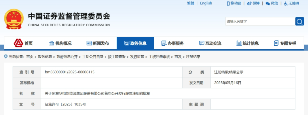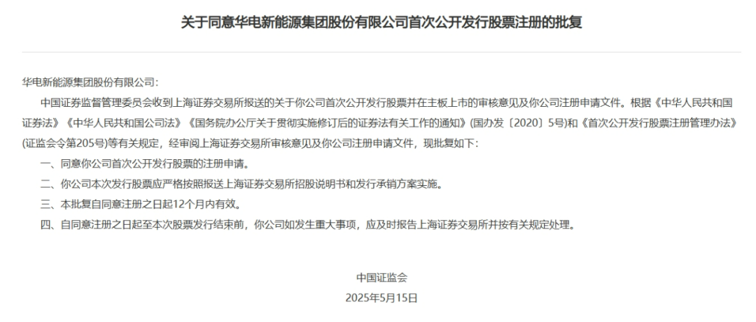 5月16日,中国华电所属华电新能源集团股份有限公司首次公开发行股票注册申请获得中国证监会批准,即将在上交所主板发行并挂牌上市。