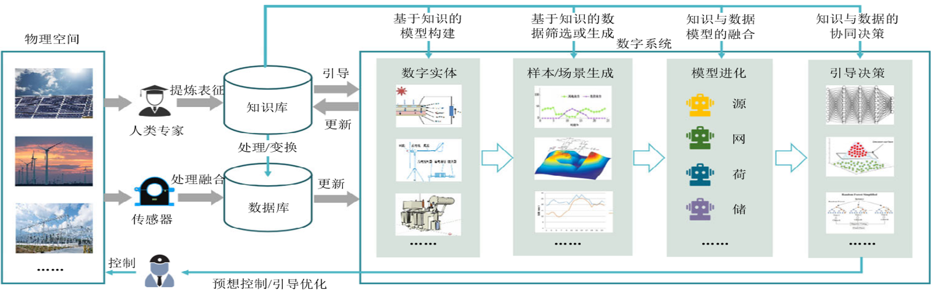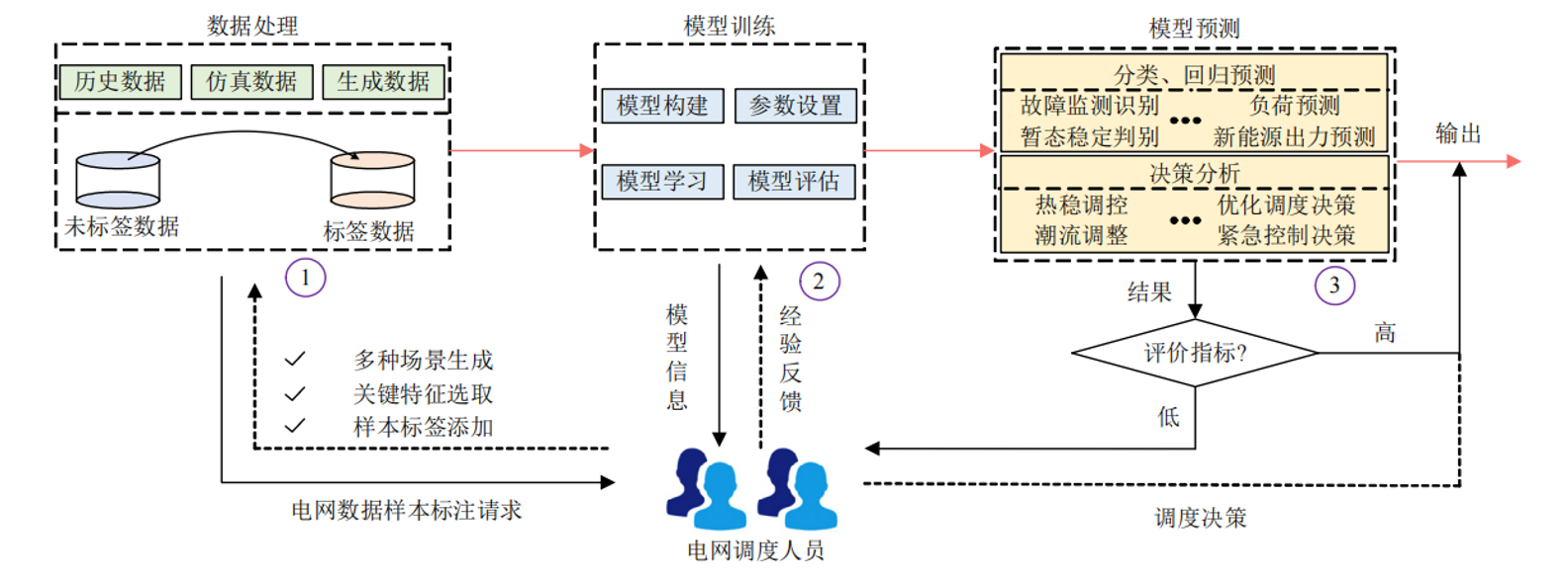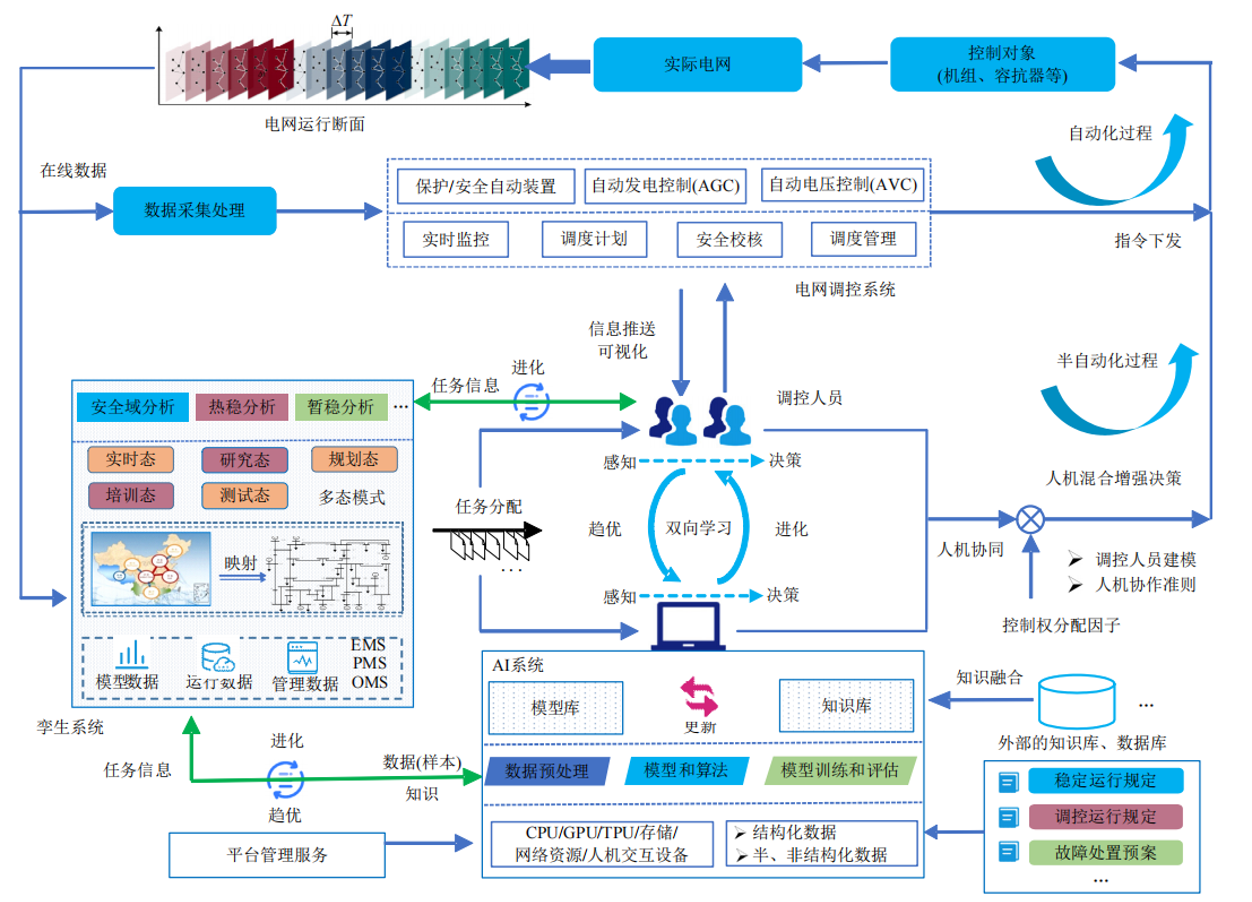 人机混合智能是指通过融合人类专家的智慧和机器的高效计算能力,实现电力系统调控的智能化。在这种模式下,人类专家负责提供决策支持、制定规则和进行定性分析:而机器则负责执行决策、进行数据处理和进行定量计算。人机混合增强智能是大电网调控领域的创新概念,它旨在通过整合人类专家的知识与经验与机器智能的计算能力,实现电网调控的优化与精化。强调在高度自动化操作的基础上,利用人工智能技术辅助电网调度员进行决策,以应对电网的复杂性与不确定性。