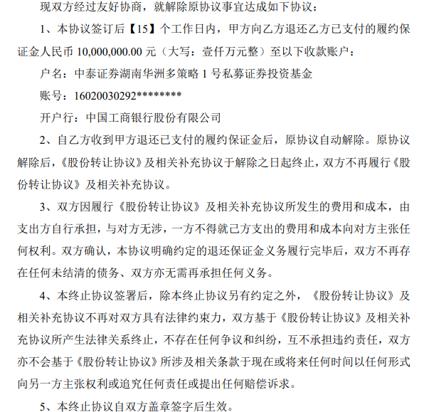 但因客观环境发生变化,双方在自愿平等的基础上友好协商,同意解除已签署的《股份转让协议》及相关补充协议,并于2025年5月14日签署《股份转让协议之终止协议》。