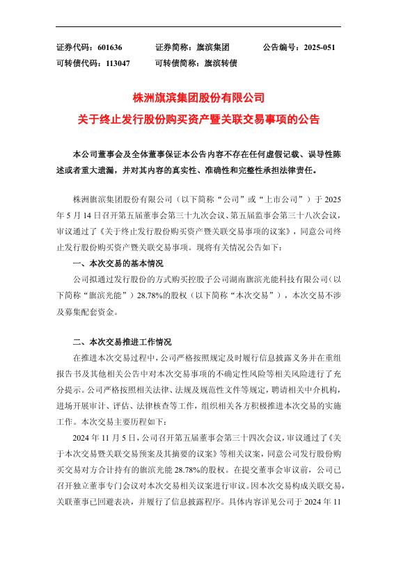 近日,旗滨集团(601636.SH)发布公告。公告显示旗滨集团决定终止通过发行股份方式购买控股子公司湖南旗滨光能科技有限公司(以下简称“旗滨光能”)28.78%股权的交易事项。