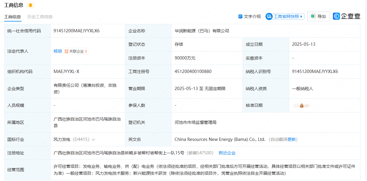 索比光伏网获悉,近日,华润新能源(巴马)有限公司成立,法定代表人为杨册,注册资本9亿元人民币,经营范围包括发电业务、输电业务、供(配)电业务、风力发电技术服务、新兴能源技术研发。股权全景穿透图显示,该公司由华润电力新能源投资有限公司、中国建筑旗下中国建筑第八工程局有限公司共同持股。