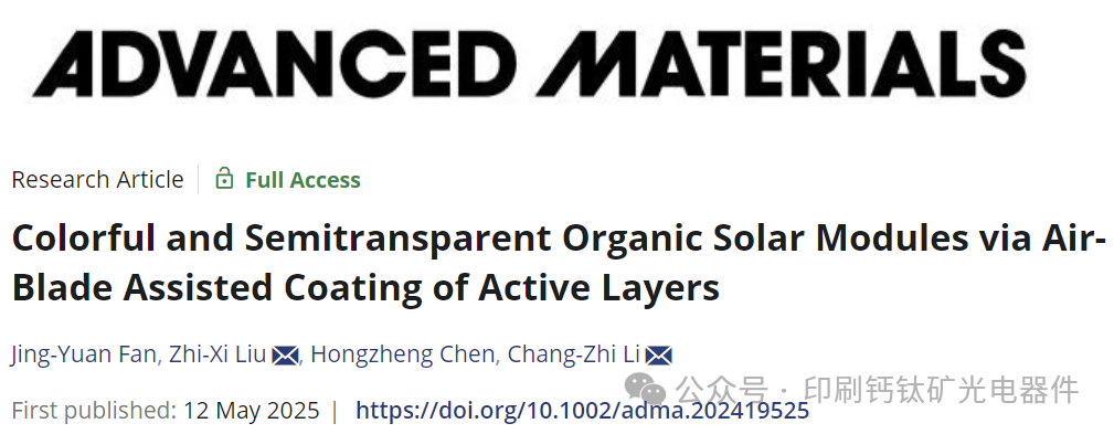 有机太阳能组件(OSMs)在建筑领域的一体化光伏设计具有潜在应用价值,但在采用非卤代溶剂涂布工艺制备均匀且大面积的活性层时面临诸多挑战。 鉴于此,浙江大学李昌治等人在期刊《Advanced Materials》发文,题为“Colorful and Semitransparent Organic Solar Modules via Air-Blade Assisted Coating of Active Layers”。本研究提出了一种室温气刀辅助(RT/A)涂布技术,该技术能够在常温、非卤代溶剂处理条件下获得均匀的活性层。研究表明,RT/A涂覆技术能够缓解在热基板涂覆过程中常见的膜不均匀性问题。与热基板涂布中因温差导致的不均匀液-固转变不同,RT/A策略通过定向气流控制成膜过程中的转变时间,从而在常温涂布条件下获得高质量的活性层共混物。RT/A策略制备的大面积活性层展现出良好的一致性和均匀性。最终制备的OSMs实现了高效率,其认证光电转换效率(PCE)为14.5%,面积为19.31 cm2(该结果已记录在太阳能电池效率表第60版中)。通过进一步集成Fabry–Pérot透明电极,成功开发出色彩丰富且半透明的组件,其PCE为12.80%。总体而言,本研究为有机光伏的可扩展制备提供了一种有前景的方法。