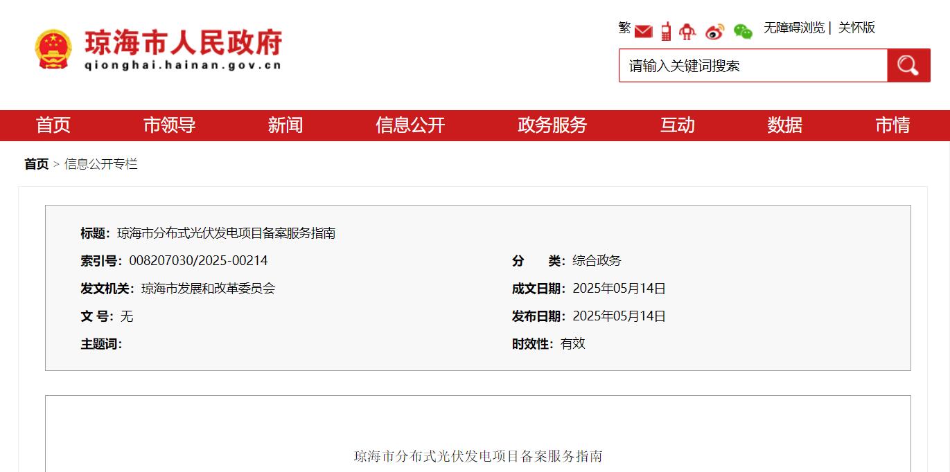 根据《海南省企业投资项目备案管理办法》(琼府办〔2018〕6号)及《海南省发展和改革委员会关于推进分布式光伏发电高质量发展有关事项的通知》(琼发改能源〔2025〕440号)文件精神,分布式光伏发电项目应按照“谁投资、谁备案”原则确定备案主体。为做好琼海市分布式光伏发电项目备案工作,特制定本服务指南。