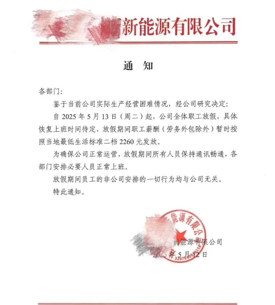 近日,又一光伏企业宣布停工停产。由于公司出现实际生产经营困难情况,决定自2025年5月13日(周二)起,公司全体职工放假,具体恢复上班时间待定,放假期间职工薪酬(劳务外包除外)暂时按照当地最低生活标准二档2260元发放,为确保公司正常运营,放假期间所有人员保持通讯畅通,各部门安排必要人员正常上班。