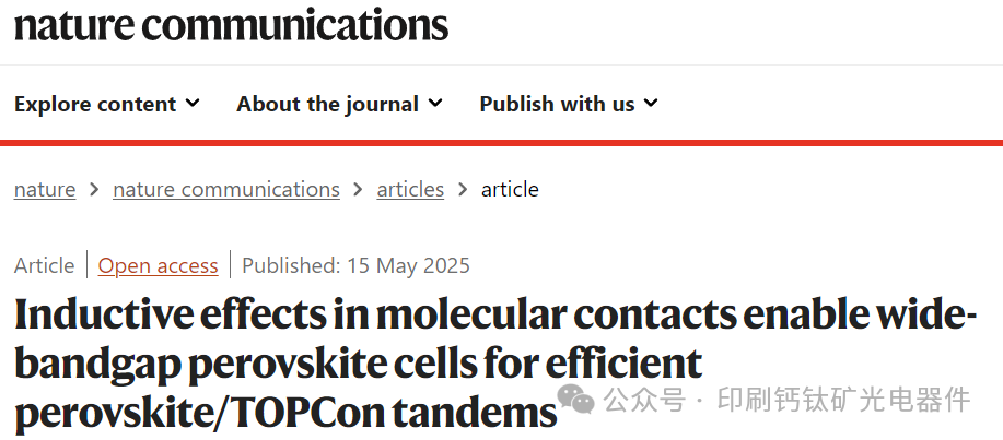 作为空穴选择性接触的有机分子——自组装单分子层(SAMs),在确保高性能钙钛矿光伏器件中起着关键作用。SAM与钙钛矿之间的最佳能级对齐对于理想的光伏性能至关重要。然而,许多SAMs是在最佳带隙钙钛矿中研究的,专门针对宽带隙钙钛矿的能级修饰有限。鉴于此,浙江大学杨德仁院士、薛晶晶研究员团队在期刊《Nature Communications 》发文,题为“Inductive effects in molecular contacts enable wide-bandgap perovskite cells for efficient perovskite/TOPCon tandems”,在此,本文证明SAMs的能级可以通过共轭部分的诱导效应进行逐步系统调谐,从而能够针对特定钙钛矿带隙进行合理设计。基于调谐后的SAM的宽带隙钙钛矿器件实现了22.8%的功率转换效率(PCE)。与晶体硅TOPCon子电池集成后,进一步构建了PCE为31.1%(认证值30.9%)的钙钛矿/TOPCon叠层器件。