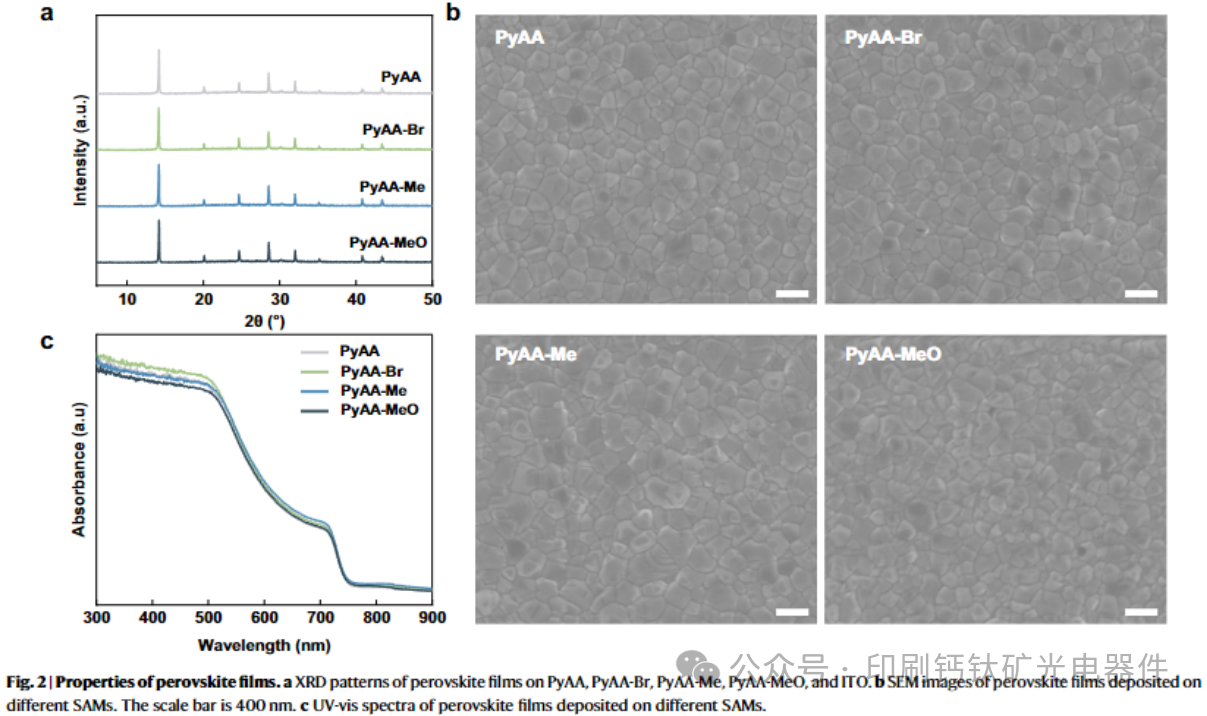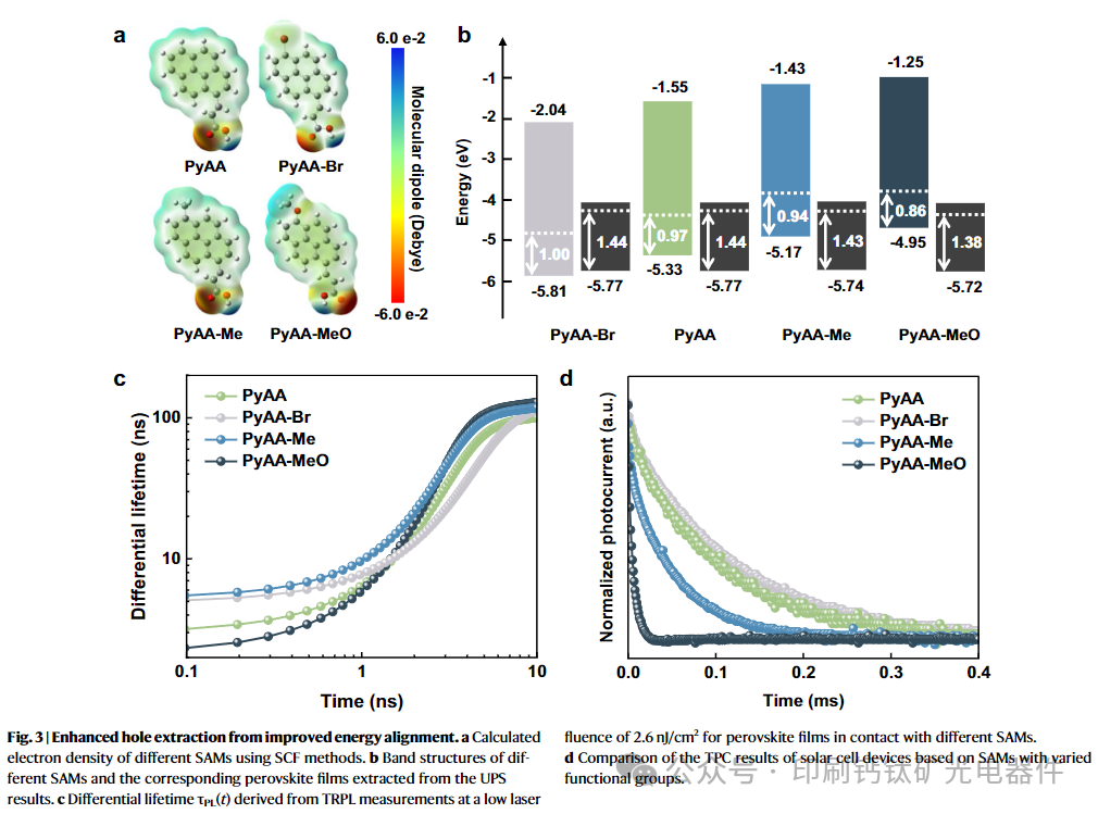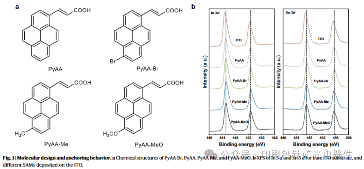 通过在共轭芘核中引入吸电子 / 给电子基团(如溴、甲基、甲氧基),利用诱导效应系统调控 SAMs 的电子密度和能级,首次实现了 SAMs 与宽带隙钙钛矿的精准能级对齐,解决了传统 SAMs 适配窄带隙钙钛矿的局限性。