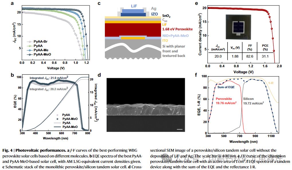 优化后的甲氧基修饰 SAM(PyAA-MeO)使宽带隙钙钛矿单结器件效率达 22.8%(VOC 1.24 V,FF 84.3%),且未封装器件在 60°C 下工作 400 小时后效率保持率超 99%。与 TOPCon 硅基子电池集成后,叠层器件效率达 31.1%(认证 30.9%),FF 达 82.6%,为同类叠层系统最高效率之一。