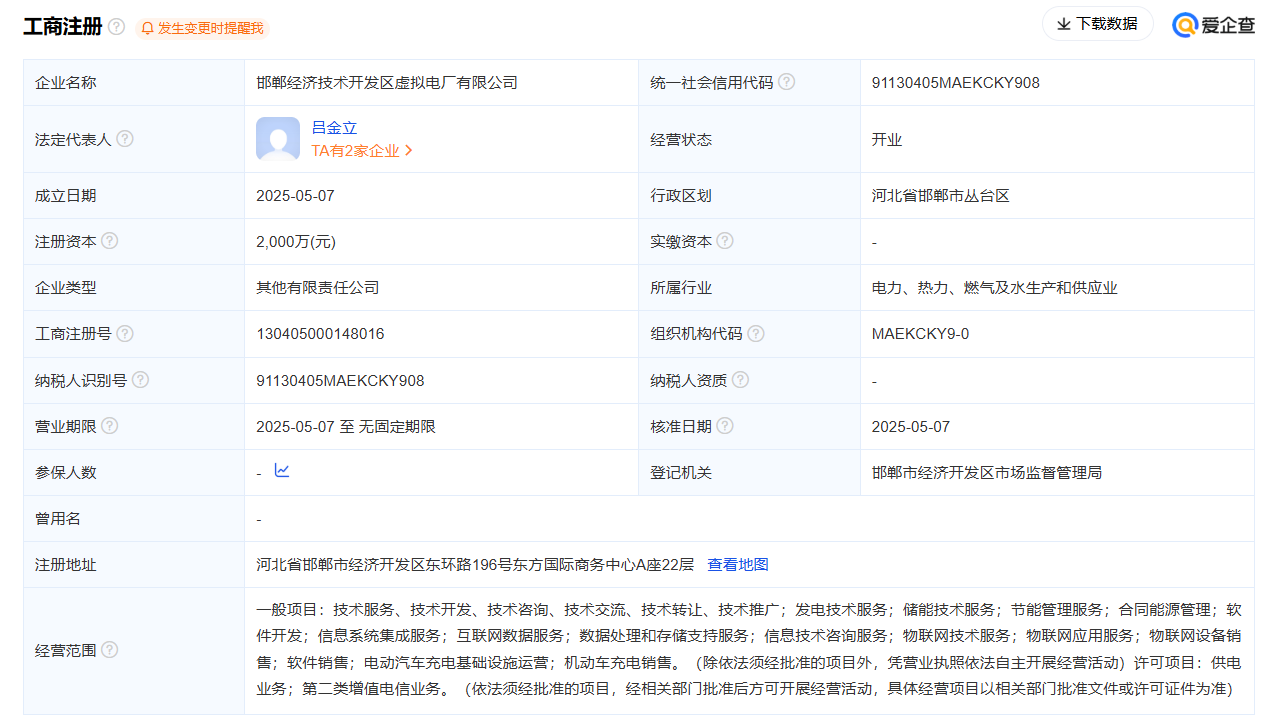 索比光伏网获悉,近日,邯郸经济技术开发区虚拟电厂有限公司成立,法定代表人为吕金立,注册资本为2000万元,经营范围包含:发电技术服务;储能技术服务;节能管理服务;合同能源管理;软件开发;物联网技术服务;机动车充电销售等。企查查股权穿透显示,该公司由邯郸经济技术开发区能源开发有限公司、特锐德旗下特来电新能源股份有限公司共同持股。