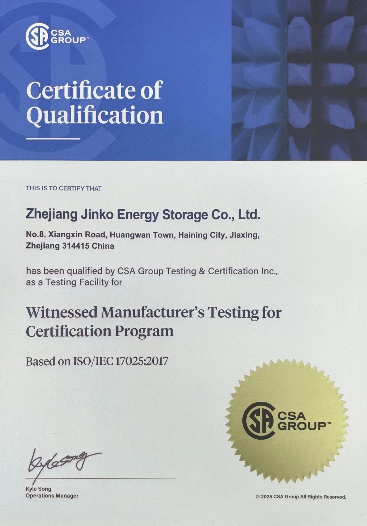作为北美市场准入的核心认证机构,CSA集团的授权不仅是对晶科储能技术实力的权威背书,更构建了企业直通国际市场的"认证快车道"。依托该资质,晶科储能可在自有实验室完成UL1973全流程认证测试,提高认证效率,加速产品上市进程。