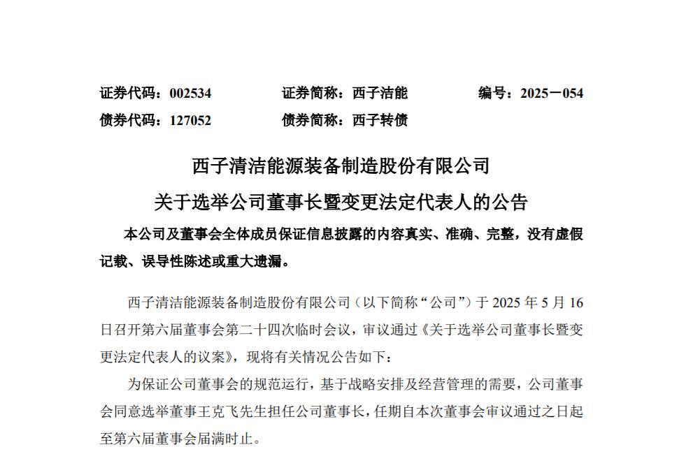 近日,西子洁能(002534.SZ)发布公告,公司董事会完成高层人事调整,选举王克飞为新任董事长,并担任公司法定代表人,同时授权管理层办理相关工商登记变更事宜。