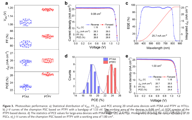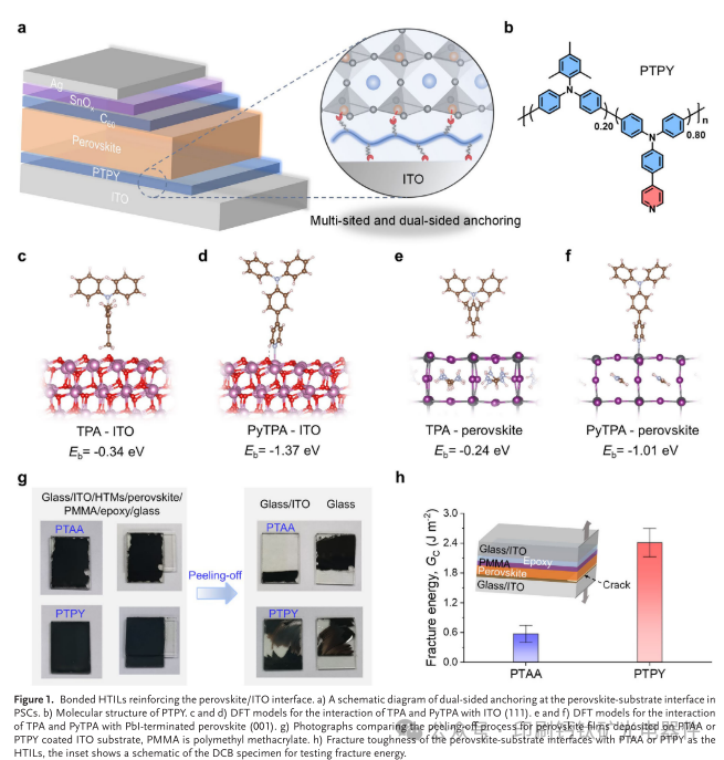 1. 双面锚定聚合物HTIL的设计:论文提出了一种新型的双面锚定聚合物HTIL(PTPY),通过在常用的聚合物HTIL PTAA中引入吡啶基团作为侧链,显著增强了界面相互作用。