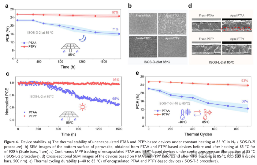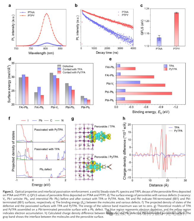 3. 缺陷钝化:PTPY的吡啶侧链设计不仅增强了机械稳定性,还通过形成新的Pb-N键部分补偿了Pb原子的八面体配位缺陷,从而钝化了表面缺陷。