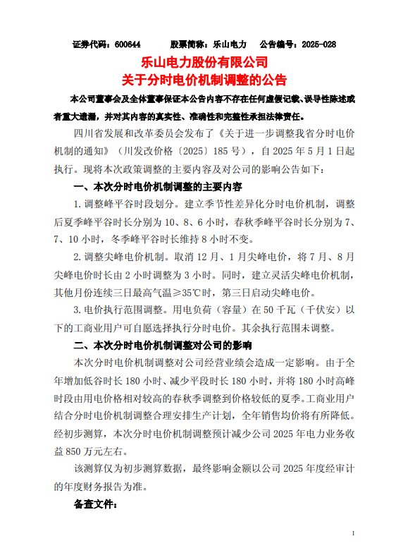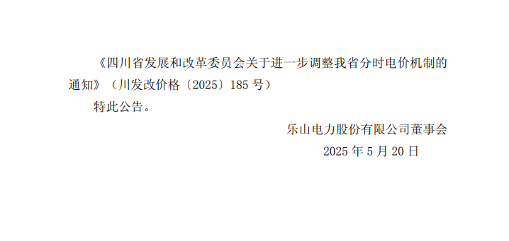 5月19日,乐山电力发布关于分时电价机制调整的公告。