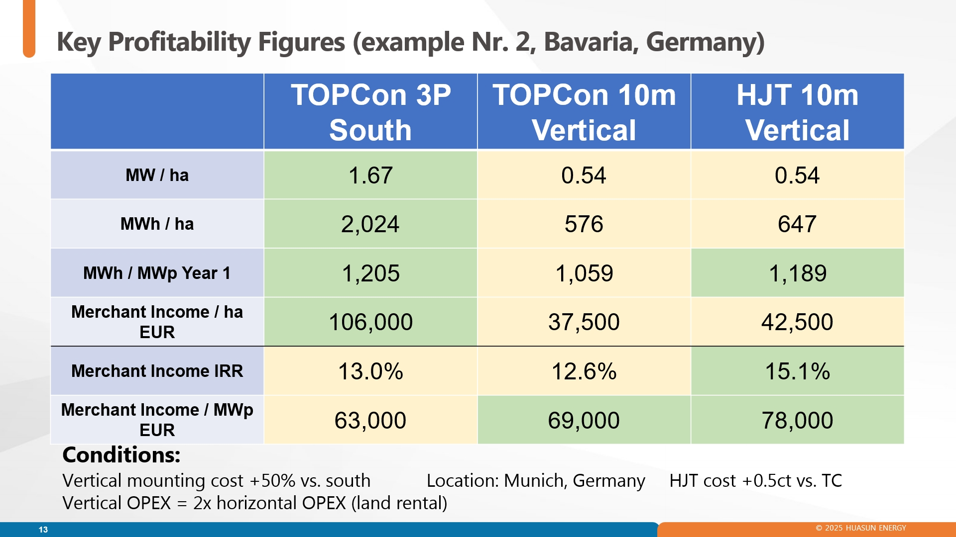 会上,Christian分享了以巴伐利亚州为背景条件的测算结果。数据显示,采用华晟昆仑系列组件的垂直光伏项目实现了高达15.1%的内部回报率(IRR),显著优于同版型TOPCon垂直光伏项目。在全球光伏市场化电价时代,这一结果有力地证明了异质结技术是投资者面对提升电价收益、降低投资风险的“破局之道”。